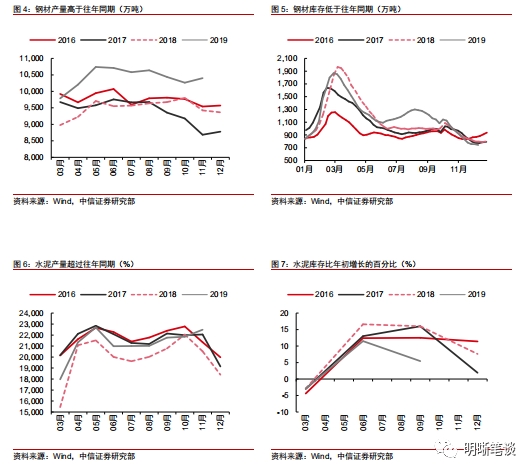 建安投资的高景气从高频数据中有所显现。从钢材方面看,根据统计局公布的数字,在钢材产量持续大超往年的情况下,钢材库存在大多数月份低于往年或与往年持平,说明钢材需求火热。从水泥方面看,今年水泥产量高于去年而略低于2016年和2017年,但水泥库存却明显低于往年,说明水泥处于供不应求的状态,这也是近期水泥价格上涨的重要原因。从钢铁水泥的产量来看,或许能够说明地产的上游企业从订单或其他信息中,获得了对于明年地产施工(可能也包括基建)较好的预期,这也是从侧面支撑建安投资在短期内走稳的证据之一。