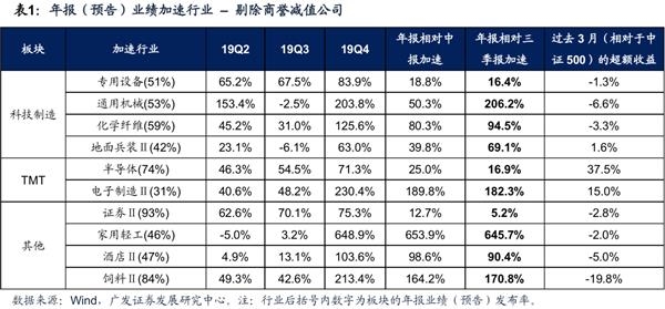 4、年报(预告)业绩加速行业:在全部A股中,剔除18年报+19年报发生商誉减值的公司(966家)后,我们筛选年报(预告)业绩增速相对于三季报和中报均加速,且年报业绩(预告)发布率在40%以上的二级行业,主要分布在:科技制造(专用设备、通用设备、化学纤维、地面兵装)、TMT(半导体、电子制造)等领域。