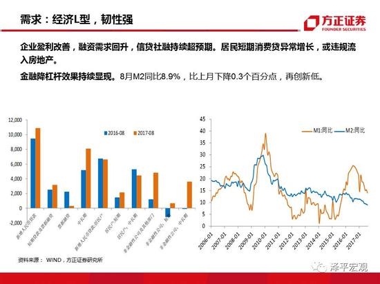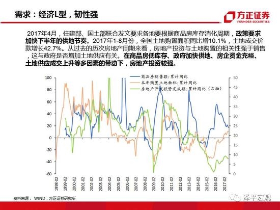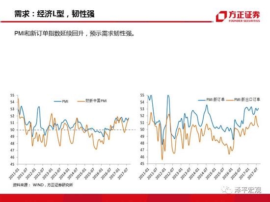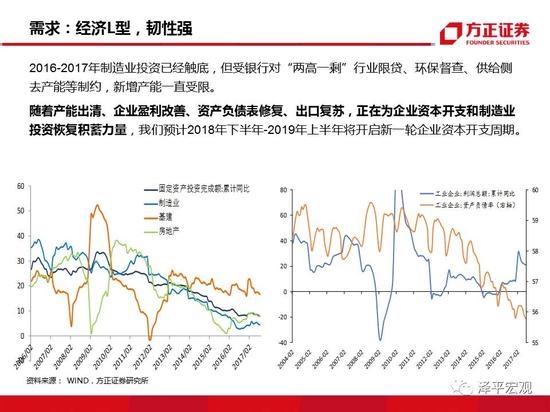 2017年四季度-2018年初经济L型,需求侧偏平略有下降,向上的力量来自出口复苏、房地产补库存和土地供应增加带动房地产投资较强、企业盈利改善资本开支恢复、融资需求回升等,向下的因素来自财政整顿基建投资放缓、再度去库存、房地产相关消费下滑等。同时,供给侧去产能和环保督查抑制短期生产以及新产能释放,导致供求缺口持续扩大,这有助于工业品价格保持高位、企业盈利持续改善。