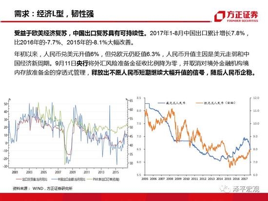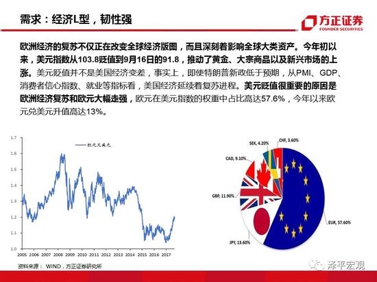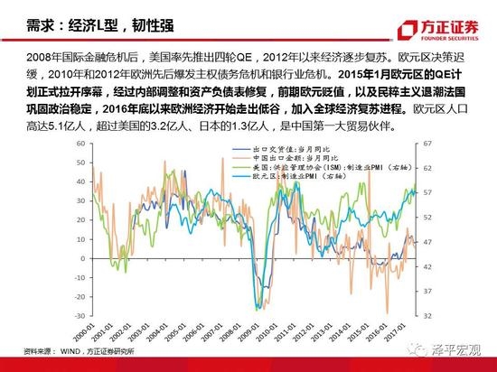 世界经济:欧洲加入全球经济复苏进程。2008年国际金融危机后,美国率先推出四轮QE,2012年以来经济逐步复苏。欧元区决策迟缓,2010年和2012年欧洲先后爆发主权债务危机和银行业危机。2015年1月欧元区的QE计划正式拉开序幕,经过内部调整和资产负债表修复,前期欧元贬值,以及民粹主义退潮法国巩固政治稳定,2016年底以来欧洲经济开始走出低谷,加入全球经济复苏进程。欧元区人口高达5.1亿人,超过美国的3.2亿人、日本的1.3亿人,是中国第一大贸易伙伴。随着欧洲加入全球经济复苏进程,中国出口显著改善,由于欧元超预期走强导致美元大幅走弱,助推黄金、商品上涨以及人民币兑美元升值。
