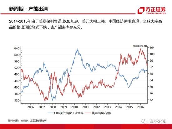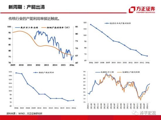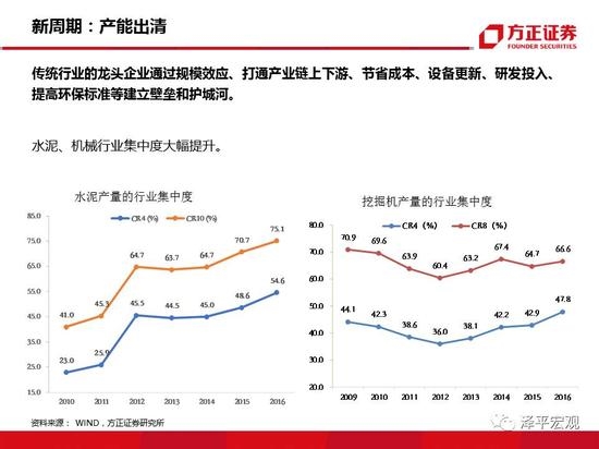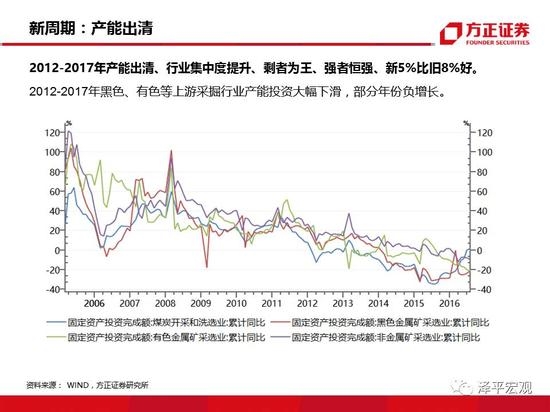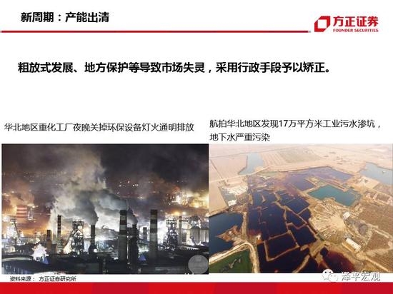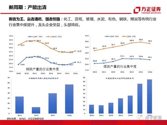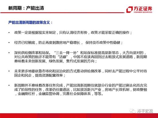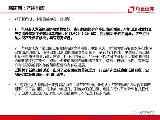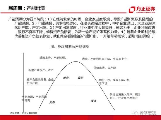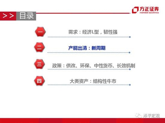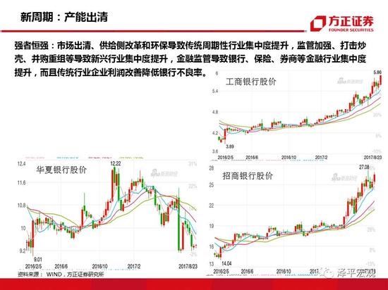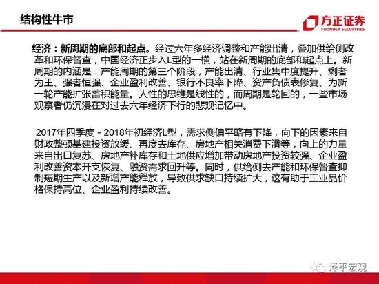 中国经济:新周期的底部和起点。经过六年多经济调整和产能出清,叠加供给侧改革和环保督查,中国经济正步入L型的一横,站在新周期的底部和起点上。新周期的内涵是:产能周期的第三个阶段,产能出清、行业集中度提升、剩者为王、强者恒强、企业盈利改善、银行不良率下降、资产负债表修复、为新一轮产能扩张蓄积能量。人性的思维是线性的,而周期是轮回的,告别对过去六年经济下行的悲观记忆。