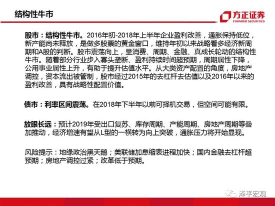 放眼长远:预计2019年前后受出口复苏、库存周期、产能周期、房地产周期等叠加推动,经济增速有望从L型的一横转为向上突破,通胀压力或将开始显现。