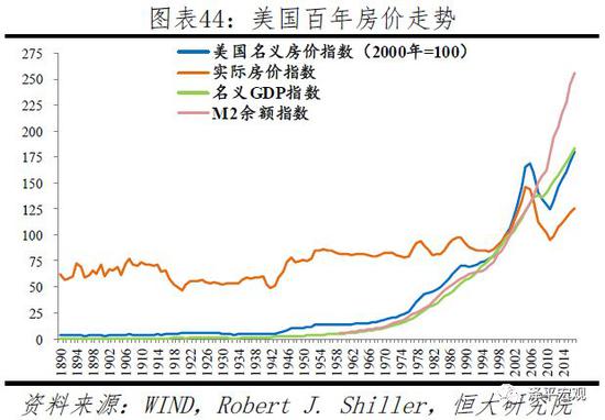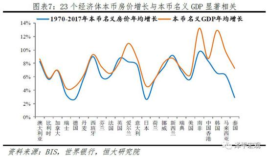 3)货币供应带来的货币幻觉。从国际经验来看,在经济发展过程中,绝大部分国家均存在不同程度的货币超发,从而引起资产价格变化。一般而言,广义货币供应增速高则通胀高。1970-2017年,23个经济体年均GDP平减指数的平均数为4.7%、中位数为4.4%,不仅在绝对水平上与23个经济体房价年均增长的平均数6.5%较为接近,而且波动较为一致。比如,1970-2017年南非广义货币增长474倍,在货币大幅超发下南非名义GDP增长387倍,实际GDP仅增长2.3倍,GDP平减指数增长116.6倍,房价上涨85.2倍;美国广义货币增长25.6倍,名义GDP增长18倍,实际GDP上涨2.7倍,GDP平减指数增长4.1倍,房价上涨13倍。但是,货币超发易滋生房地产等资产价格泡沫,极端情况下甚至可能引发经济危机,比如1990年代日本房地产泡沫和2007年美国次贷危机。