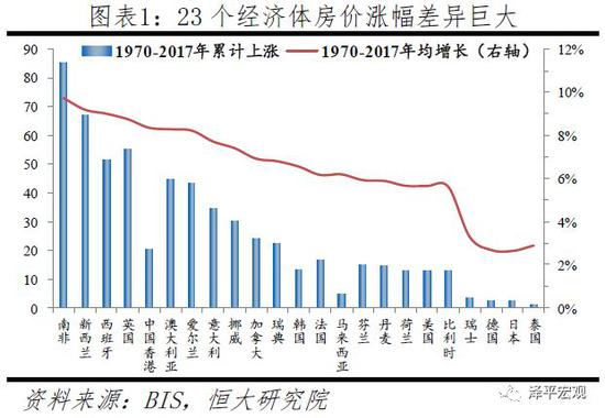 1970-2017年23个经济体房价平均累计上涨20.6倍、年均增长6.5%、,其中有南非、英国、澳大利亚等7个经济体累计涨幅在40倍以上或年均增长超过8%,也有德国、瑞士、日本等3国累计涨幅低于4倍或年均增长低于3.5%。根据国际清算银行(BIS)统计,1970-2017年23个经济体房价年均增速平均为6.5%,折合累计涨幅为20.6倍(其中,BIS对西班牙、韩国、中国香港、马来西亚、泰国房价数据分别从1971、1975、1979、1988、1991年开始统计)。依据房价涨幅大小,可大体分为三类: