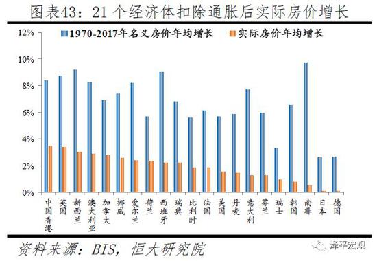 以美元计,1970-2017年21个经济体房价涨幅发生明显变化,且美元房价涨幅与美元名义GDP增长存在一定相关性。如果一经济体货币超发较美国严重,则货币将对美元贬值,因此本币房价大幅上涨并不意味着美元房价大幅上涨,在全球来看并不一定具备投资价值。依据美元房价涨幅,可大体分为四类:一是累计涨幅超过40倍或年均增长超过8%,仅新西兰1个。二是累计涨幅25-30倍或年均增长7%-7.5%,有澳大利亚、英国、西班牙、中国香港、挪威、爱尔兰、荷兰等7个经济体。三是累计涨幅10-20倍或年均增长5%-6.6%,有加拿大、比利时、法国、日本等10个经济体。四是累计涨幅低于7倍或年均增长4.5%以下,有韩国、德国、南非等3个经济体。与本币房价涨幅相比,变化最大的是南非,1970-2017年本币房价涨幅高达85.2倍,但美元房价涨幅仅为3.6倍。此外,瑞士本币房价涨幅仅3.7倍,但美元房价达20.1倍;意大利本币房价上涨34.4倍,但美元房价涨幅缩至11.9倍;德国本币房价上涨2.6倍,美元房价上涨6.5倍。