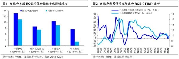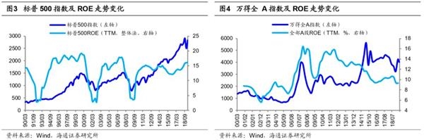 拉长看,业绩是驱动市场的主力,ROE更适宜跟踪长期盈利。《投资世界长期属于乐观者-20170710》中,我们分析到横向对比全球,各地股指年化涨幅与GDP名义年化增速表现出高度相关,经济增速越高的国家股市表现越强劲,比如中国A股自1991以来股指年化涨幅为11.6%、名义GDP年化增速为14.2%;中国香港自1964年来分别为10.4%、10.3%;中国台湾自1968年来分别为9.0%、9.3%;韩国自1980年来分别为8.6%、10.5%;德国自1970年来分别为6.7%、4.7%;美国自1929年来分别为5.5%、6.1%;英国自1984年来分别为5.0%、5.3%;日本自1970年以来为4.8%、4.2%;法国自1988年来分别为2.9%、2.6%。回顾A股历史,1991年以来上证综指年化涨幅为11.6%,EPS为22.9%,PE为-9.2%,1996年实行涨跌停板以来上证综指指数年化涨幅为7.8%,EPS为9.6%,PE为-1.7%,2005年股权分置改革以来上证综指年化涨幅为6.8%,EPS为9.9%,PE为-2.8%,长期看业绩是驱动市场上涨的主力。通常,我们追踪A股业绩主要观察净利同比、ROE等指标,两者历史走势大致趋同,但净利同比易受到基期影响而波动较大,相对而言ROE走势更平缓且更适宜跟踪长期盈利。而且,通过回溯中美股市行情及ROE走势,我们发现长期看ROE走势与股指基本趋同。自1990年以来标普500指数年化涨幅为11.0%,对应ROE(TTM,整体法,下同)均值为13.1%,自1995年以来万得全A指数年化涨幅为9.0%,对应ROE均值为10.4%,可见更高的ROE对应更高的股指涨幅。进一步分析盈利周期,自1990年以来标普500指数ROE经历三次回升期,在第一次回升期(92Q1-00Q1)ROE从3.0%升至19.1%,指数上涨271%,第二次回升期(02Q4-07Q2)ROE从2.9%升至17.7%,指数上涨71%,第三次回升期(08Q4-19Q1)ROE从4.3%升至16.1%,指数上涨213.8%。自2005年以来万得全A指数ROE经历三轮回升期,在第一次回升期(06Q1-07Q4)ROE从7.3%升至16.4%,指数上涨464%,在第二次回升期(09Q2-10Q3)ROE从10.3%升至15.4%,指数上涨27%,在第三次回升期(16Q2-18Q2)ROE从9.4%升至10.6%,指数上涨8%。