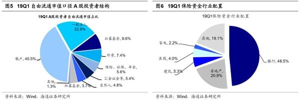 险资、外资、银行理财等代表性长线资金偏好高ROE个股。《股权时代长线资金将改变A股生态-20190425》中,我们提出中国金融供给侧改革背景类似1980年代美国,即股权融资支撑产业结构转型,参考海外经验,长线资金持股更偏向龙头、高ROE特征,引入长线资金将改变A股生态。与美股相比,我国的长线资金更加多样化,包括外资、保险类资金以及银行理财三者,但是三者仍在起步阶段:第一,外资方面,2018年A股外资持股占比为4%,而中国台湾为38%,韩国为32%,美国为15%,对比国际我国外资持股占比仍偏低。第二,保险类资金方面,2017年美国养老金体系中三大支柱合计31万亿美元,保险公司资金9万亿美元,共计40万亿美元,为美国当年GDP的两倍。对比之下,2017年我国养老金三大支柱只有9万亿人民币,算上保险公司资金后,保险类资金也只有24万亿人民币,占GDP不到30%,且这24万亿的保险类资金中进入股市的资金,按流通市值口径为1.93万亿、占比4%,按自由流通市值为1.27万亿、占比6%。可见,不管是绝对规模还是入市规模上,我国保险类资金均有较大的提升空间。第三,银行理财方面,2018年我国银行理财资金余额为32万亿,但是其中投向股票的比例不及2%,入市比例也极低。进入2019年,各银行陆续设立理财子公司,未来将发行银行理财公募产品,银行理财规模和持股比例有望进一步上升。对比美股,我国机构投资者占比较低,而且各个机构有不同的投资期限与投资目标,如公募基金考核收益率排名,考核期1年;保险资金考核绝对收益,兼顾相对排名,股票投资年化收益率目标要求8%左右,考核期也是1年;而外资机构通常考核是否跑赢基准指数,如沪深300或MSCI China指数,考核期略长,一般为3年。不同的考核期限与目标导致不同的机构投资者投资偏好有所不同,险资、外资及银行理财等代表性长线资金更偏爱高ROE个股。截止2019/5/31,陆港通北上资金前15大重仓股(持仓额占北上资金总持仓额的50%)19Q1ROE(TTM)中位数为21.2%,19Q1QFII重仓股为8.4%,保险重仓股为8.7%,均高于全部A股中位数6.8%。