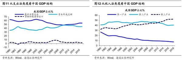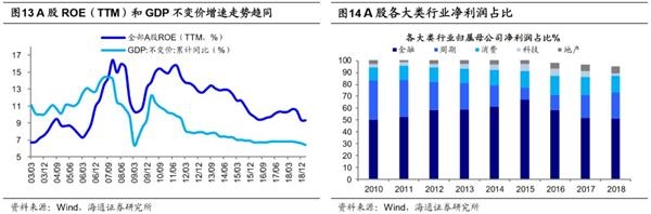 未来ROE波动收窄,源于经济结构改善。近几年我国GDP增速虽然放缓,但内部结构却在不断优化,企业盈利在改善。进入新时代之后,宏观经济的基本面特征为经济平盈利上,微观盈利改善的动力源于产业结构优化和行业集中度提高,而且盈利韧性变强、波动性变小(详见《为何新时代经济平盈利上?——借鉴日本1970-80年代》-20171027)。从经济结构来看,我国正从需求扩张型经济转向结构优化型经济,产业重心从工业化+地产链转向信息化+服务消费。从GDP收入法角度看,2000-2010年期间,我国第三产业GDP占比从40%提升至44%,仅提高4个百分点;但在2010-2018,第三产业GDP占比从44%提高到52%,提高了个8百分点。从GDP支出法角度看,2010年以来消费的GDP占比趋势上升,从2010年的48.5%提升至2017年的53.6%,而资本形成GDP占比从47.9%降至44.4%,净出口占比从3.7%降至2.0%。在结构优化型经济下,企业盈利变化更加平缓,ROE波动收窄,16Q2-18Q2期间ROE从低点到高点回升1.2个百分点,而06Q1-07Q4、09Q2-10Q3期间分别回升9.2、5.1个百分点,可见最新一轮盈利周期中ROE波动收窄。这是因为:一方面,盈利稳定的高ROE消费类占比提高,而盈利波动大的周期占比下降。从A股大类行业角度看,消费业净利润占比从2010年的11.2%升至2018年的14.0%,地产从3.5%升至6.1%,金融从50.2%升至51.3%,周期从33.2%降至21.8%,科技维持在2-3%。另一方面,各行业集中度提高,高ROE龙头占比提高,助推ROE波动变小。随着宏观经济增长逐渐步入L型一横阶段,未来ROE中枢较2000-2010年期间有所下降,但是预计整体中枢降幅不大,ROE不像GDP打六折,很可能打八-九折,甚至基本不变。历史上,A股ROE和实际GDP同比走势基本一致,1978年-2010年GDP高速增长,A股ROE随着经济周期而剧烈波动,随着2010-16年GDP增速换挡,A股ROE从15%逐渐降至10%左右。自16年以来ROE波动收窄,预计19Q3见底,按照ROE平均上行8个季度推算,预计下轮ROE回升周期高点在21Q3。今年全国两会期间提到GDP增长目标为6-6.5%,Wind一致预期显示2020、2021年我国GDP同比为6.3%、6.0%,参考16Q2-19Q3这轮盈利周期,预计2021年A股ROE高点将达10.5%左右。