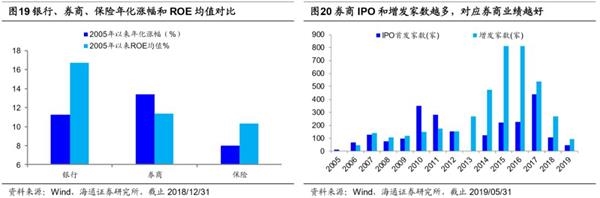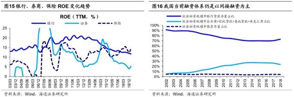 金融:对比美国,未来银行下降、券商上升,保险有望保持高位。自2005年以来,A股银行年化涨幅为11.3%、ROE均值为16.7%,券商为13.4%、11.3%、保险为11.4%、10.3%,股指涨幅与ROE基本对应。为支持产业结构升级,我国大力发展直接融资,预计银行ROE将下行、券商ROE将提升。2月中央政治局会议指出“金融是国家重要的核心竞争力”,并指出要“深化金融供给侧结构性改革”,这预示着我国融资体系将发生变化,股权融资占比将逐渐提高。当前我国融资体系依然是以间接融资为主,在18年我国社会融资中间接融资占比达73%,而直接融资(股权+债券+信托贷款+委托贷款+承兑汇票)为23%,其中股票为4%。我国银行ROE早已步入下行阶段,从11Q3高点21.2%降至19Q1低点11.8%,低于2005年以来ROE中枢17%。对比国际,18年美股银行业ROE为10.5%,随着股权融资时代来临,预计我国银行ROE将继续下行。券商目前收入来源主要是交易佣金、投行、自营、资管等,第一个与市场行情有关,随着牛熊切换而剧烈波动,后三个与业务创新程度有关,业务创新将助推券商扩大业务范围,如05股权分置改革、13-15年鼓励并购重组等,这就导致券商业绩随着市场行情和业务创新程度而剧烈波动。最近一轮盈利周期中,券商ROE从15Q2高点19.3%一路降至18Q4低点4.0%,19Q1略回升至5.2%。对比国际,18年美股券商行业ROE为10.9%,随着未来券商业务多元化,开拓如股指期货、个股期权等衍生工具,我国龙头券商有望增厚业绩。我国券商2005年以来ROE中枢为11%,目前ROE处在历史偏低位,未来ROE有望进一步提升。随着国民财富增加和保障意识提升,我国保险大力发展,预计保险ROE将保持高位。截止17年我国保费总收入达到3.7万亿元,仅次于美国,然而从保险密度和深度看,我国保险业与主要国家差距大,保险市场体量有待进一步扩张。从保险密度(总保费/人数)看,18年中国寿险密度为216美元/人,而日本为3568美元/人,英国为3269美元/人。从保险深度(总保费/GDP)看,18年中国寿险深度为2.3%,而日本为9.0%,英国为8.6%。在这样背景下,我国保险业绩持续改善,保险ROE从16Q3低点10.4%升至18Q2高点15.5%,此后略回落至19Q1的14.3%,而2005年以来ROE中枢为11%,目前处在历史偏高位,预计未来保险ROE也将保持高位。