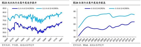 消费:家电、白酒保持高位,医药内部分化,纺服、零售较弱。自2005年以来,A股家电年化涨幅为18.3%、ROE均值为12.2%,白酒为25.2%、22.9%,医疗器械为15.6%、8.6%,化学制药为15.3%、10.1%,纺服为6.6%、8.6%,零售为15.6%、8.6%,股指涨幅与ROE基本对应。家电、白酒ROE保持高位,是因为行业进入寡头竞争时代,龙头受益于行业集中度提升和品牌优势。这次盈利周期中,家电ROE从16Q1低点14.6%升至18Q2高点19.3%,此后回落至19Q1的14.8%,白酒从16Q1低点17.9%升至18Q2高点25.3%,此后回落至19Q1的24.6%,两者均高于19Q1全部A股ROE9.3%。家电、白酒行业已从充分竞争过渡到寡头竞争时代,优势品牌龙头胜出,比如洗衣机销售额CR3从06年的57%升至18年的68%,CR5从70%升至80%,白酒销售额CR3从00年的42%升至18年的64%,CR5从55%升至75%。家电、白酒业绩较为稳定,2005年以来ROE均值分别为12.2%、22.9%。投资角度看,消费白马股估值和盈利匹配度较重要,ROE作为衡量长期业绩的指标,非常具有参考意义。医药行业ROE内部分化,其中传统制药偏低、医疗器械较高,这是因为医改推动药品定价机制重构,集中采购、基本药物制度、药品定价机制、一致性评价、两票制、鼓励高端仿制、审评审批制度改革、辅助用药等有助降低不合理药价,这导致化学制药业绩下滑。最新盈利周期中,医药ROE从17Q1低点10.4%升至18Q2高点11.9%,此后回落至19Q1的9.2%。其中,19Q1医疗器械ROE为11.9%,医疗服务为6.9%,化学制药为6.4%,内部分化较明显。我国人口老龄化程度正在不断加深,65岁以上人口占比从2000年的7.0%升至2018年的11.9%,根据联合国预测,2050年我国65岁以上老年人口比重将升至26.3%,此后达三分之一以上。与发达国家相比,当前我国医疗卫生支出规模还较小,2015年我国医疗卫生支出占GDP比重为5.3%,而美国为16.8%,日本为10.9%,英国9.9%。从以上数据可以看出,我国医疗市场需求广阔,虽然短期医药行业ROE内部分化,但是长期看行业整体有望保持高位。纺服、零售的竞争格局更激烈,优质品牌和龙头公司占据市场份额不够高,这反映到业绩上,ROE处于偏低位置。这轮盈利周期中,纺织服装ROE从17Q1低点8.2%升至18Q3的8.0%,商贸零售从16Q2低点3.6%升至19Q1高点8.5%,分别低于2005年以来均值为8.6%、8.6%,预计两者ROE未来依旧较弱。