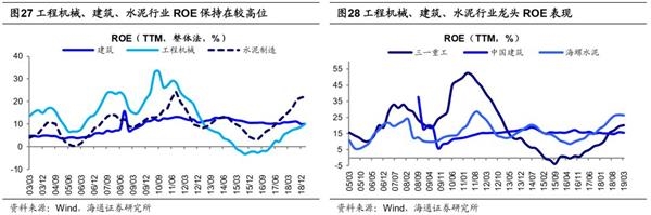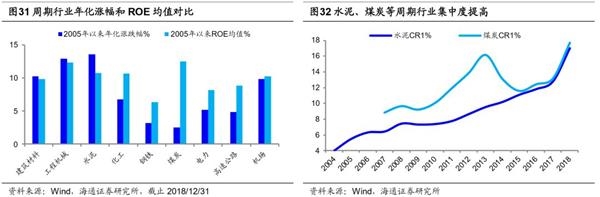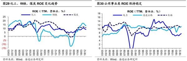 周期:工程机械、建筑、水泥保持高位,化工、煤炭、钢铁波动大,未来趋同公用事业。自2005年以来,A股工程机械年化涨幅为12.9%、ROE均值为12.3%,建筑为10.2%、9.8%,水泥为13.6%、10.8%,化工为6.7%、10.6%,煤炭为2.5%、12.4%,钢铁为3.2%、6.3%,电力为5.1%、8.2%,公路为4.9%、8.9%,机场为9.8%、10.3%,股指涨幅与ROE基本对应。工程机械、建筑、水泥ROE保持高位,这是因为龙头优势突出,市场份额占比较大。工程机械行业国内品牌占有率持续提高,且市占率向龙头集中,根据中国工程机械工业协会数据,1-4月国产、欧美、日系、韩系挖掘机市占率分别为64%、14%、11%、10%,较去年同期提升6.9、-1.6、-4.0、-1.5个百分点,其中国内龙头三一重工、徐工机械、柳工市占率为24%、14%、7%,较去年同期提升0.6、0.5、0.9个百分点。我国建筑行业头部央企优势显著,过去几年前五大上市建筑央企营收长期占全行业70%左右。水泥龙头海螺水泥市占率不断提高,销量占比从2004年的4%一路攀升至2018年的17%。此外,我国工程机械和建筑颇具国际竞争力,“一带一路”沿线国家已成为重要出口市场,机械代表性龙头企业如三一、柳工18年海外业务收入占比分别达24%、13%,建筑代表性龙头如中国电建、中国交建、中国建筑18年海外业务占比分别达23%、19%、8%。行业格局决定了盈利能力,19Q1工程机械ROE为10.2%、建筑为10.0%、水泥为22.2%,而2005年以来三者ROE均值分别为12.3%、9.8%、10.8%,ROE均保持高位,未来这一趋势有望延续。投资角度看,工程机械和建筑龙头估值和盈利匹配度较重要,ROE作为衡量长期业绩的指标,值得密切跟踪。强周期性行业如煤炭、钢铁、化工以往业绩波动性大,这是因为在以往工业化社会中地产链成为经济增长重心,从而信贷周期扩张-收缩带动相关周期行业盈利改善-下滑。然而,最近一轮周期行业盈利回升却不是源于信贷扩张带来的需求改善,而是因为供给侧改革导致周期品价格回升。自15年以来我国提出供给侧改革,钢铁和煤炭等代表性资源品通过限产实现价格回升、业绩改善,化工ROE从16Q2低点4.7%升至18Q3高点10.7%,钢铁从16Q1低点-12.6%升至18Q3高点16.7%,煤炭从16Q1低点-1.0%升至18Q3高点12.0%。然而,通过限产实现的盈利改善是难持续的,19Q1化工ROE降至8.8%,钢铁为13.5%,煤炭为11.1%。可见,周期类业绩波动性大,但是随着我国经济发展重心从工业向消费+科技转型,周期类业绩波动趋缓,其ROE有望向公用事业行业趋同。典型的公用事业如电力、高速公路、机场市场需求稳定,从而业绩波动性小,ROE趋于稳定,19Q1电力ROE为7.6%,高速公路为11.2%,机场为11.0%。