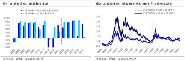 近几年A股与美股相关性明显提高。近几年中国金融市场对外开放的步伐在不断加快,我国在2014年11月与2016年12月先后推出沪股通与深港通,在2019年6月开通的沪伦通。2018年以来各大指数相继将A股纳入其指数体系:MSCI从18年6月开始将A股纳入MSCI新兴市场指数,至2019年11月纳入因子已经提升至20%,FTSE指数体系从19年6月开始纳入A股,至20年3月纳入因子也将提升至20%,S&P指数体系则将A股的纳入因子于19年9月一步调整至25%。随着A股对外开放程度加大,A股与海外市场联动的效应也越来越强。以A股和美股、港股的相关性为例,观察 05年至今沪深300和标普500指数、沪深300与恒生指数的历史相关性系数(历年相关系数根据250 个交易日的指数收益率计算得出),可以发现2015年是一个分水岭,在此之前A股与美股的同步性并不强,而在2015年之后A股与美股、港股市场的相关性明显提高。在2005-2014年间,沪深300指数和标普500指数的相关系数平均仅0.36,2015年以来两者相关系数升至0.66。在2005-2014年间,沪深300指数与恒生指数的相关系数平均为0.58,2015年以来两者相关系数进一步升至0.75。