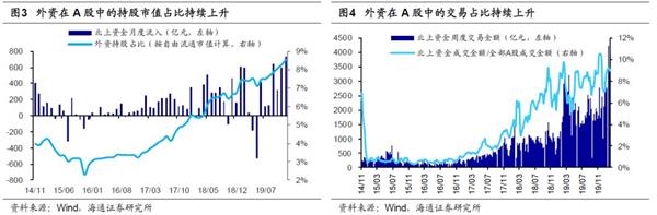A股与美股相关性提高源于外资占比提升。制度改革和国际指数的纳入使得外资流入A股的节奏大大加快,近几年A股中外资的占比明显提升。经过我们测算,14-16年外资每年净流入约在1000亿元左右,而17-19年三年净流入量分别是2280、3360、3800亿元。从外资持股市值看,2013年底时境外机构和个人持有A股市值为3500亿元,到19年底时已经上升为2.1万亿元(7000亿为Q/RQFII,1.4万亿为陆股通),上涨了5倍。目前外资在A股中的重要性已经不可轻视,从市值占比看,外资在A股自由流通市值中的占比已从13年的3.8%上升到19年的8.6%,接近险资和公募的比例(两者皆为10%),陆股通北上资金在A股成交额中的占比已从14年的0.7%上升到19年的8%,而全部公募为7%。外资在A股中的占比越来越大,因此每当海外股市波动时,A股也会因为外资的流入流出而短期受到扰动。