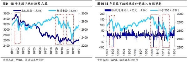 ⑤ 2018年12月在美联储加息、美国经济放缓、国债利率倒挂等背景下,投资者风险偏好再次下降,美股从18/12/3开始回落,快速下跌至12月26日,最大跌幅16%。美股下跌减缓了A股外资的流入速度,2018/12/3-12/26期间陆股通北上资金净流入仅12亿元,A股同步下跌,上证综指从12月4日的2666点跌至19/01/04最低的2440点,最大跌幅为8%。
