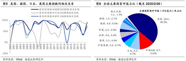 美股对全球市场影响力较强。美国经济总量排名全球第一,并且拥有全球最大的证券市场。2019年美国GDP总量为21.4万亿美元(全球占比约25%),其次是中国约14.2万亿美元(16.5%)。截至2020/2/26,美股总市值34.6万亿美元(全球总市值占比46.5%),其次是A股的9.7万亿美元(全球市值占比13%)和日本股市6.5万亿美元(占比8.7%)。美股对全球市场都有极强的影响力。具体来看,观察2000年以来美股和英国、日本、德国等主要市场指数间的相关系数(根据历年250 个交易日的指数收益率计算),道琼斯指数和德国DAX指数的平均相关系数为0.75,道琼斯指数和日经225指数的平均相关系数为0.6,道琼斯指数和英国富时100指数的平均相关系数为0.76。美股短期的上涨和下跌会影响全球市场的风险偏好,从而引发全球股市的同步波动。