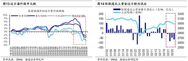 短期A股进入调整期,中期牛市格局未变。如前所述,历史上海外股市动荡难免会波及A股,这次海外大跌也在诱发A股短期调整。2月25-2月26日,A股大幅震荡,沪深300指数累计下跌1.45%,创业板指26日大幅下跌4.7%。截至2月26日,北向资金连续4日净流出,累计净流出213.8亿元。在《策略周报-乐观中保持理性-20200223》中我们就指出,市场在经历了急跌后快速上涨3周后,有调整压力,2月4日以来市场急跌后上涨源于疫情的对冲政策很强,流动性充裕,但是受疫情影响短期基本面数据仍差,港股在春节后第3周已经开始回调。从基本面来看,受疫情影响春节后发电量、地产销量等高频数据大幅低于往年同期,2、3月经济数据恐受到拖累,并且海外疫情蔓延可能拖累全球经济影响我国出口。我们认为2月4日后一段时间市场形态可能类似19年8月6日-12月初,市场表现为进二退一,源于基本面数据还未见底。中长期看,牛市的三个逻辑没动摇,即牛熊周期轮回、企业盈利见底回升、大类资产偏向股市。我们认为A股盈利W型筑底,上市公司净利润同比2季度后仍然会回升,2020年全年将达到10%-12%,高于19年的8%,牛市逐渐将进入3浪上涨的逻辑未变,3浪加速需要等疫情控制住,经济活动完全恢复,详见《现在类似2005年-20190217》、《牛市有三个阶段-20190303》、《“牛”转乾坤——2020年A股投资策略-20191117》。当然,如果未来全球疫情长期得不到控制,将对全球经济增长造成冲击,甚至再次引发类似08年的全球经济衰退风险,目前看这种情况出现的概率较小。