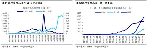 近期疫情海外蔓延引发海外市场恐慌。受新冠肺炎疫情影响,2月20日以来全球股市快速下跌。截至2月25日4个交易日中,标普500指数最大跌幅8.0%(下同),富时100指数跌6.4%,德国DAX指数跌7.3%,日经225指数跌6.3%,韩国综合指数下跌7.1%。而近期海外市场再度大跌,主要源自疫情在海外开始蔓延。以2月20日为分界线,在这之前新冠肺炎的爆发主要集中在中国内地,海外虽有确诊病例,但多为个例。2月20日开始,意大利和韩国确诊人数大幅上升,引发人们对中国大陆以外疫情的关注。韩国方面,自1月20日发现首例新冠肺炎病例以来,每日新增确诊人数寥寥无几,直至2月19日起疫情主要在大邱和庆北地区集中爆发,2月20日确诊人数破百,2月26日人数破千。23日韩国将新冠肺炎疫情预警级别提升至最高的“严重”级别,25日韩国决定将对大邱和庆尚北道地区实施最大程度封锁。意大利方面,自1月30日确诊首例病例以来,至2月20日累计确诊新冠肺炎一直为3例。然而,21日起意大利新冠疫情出现恶化态势,当日新增13例,至少9座城市下令为期一周关闭学校、酒吧等公共场所,意大利北部11个市镇封城隔离。截至2月25日意大利累计确诊病例323例,是欧洲疫情最严重的国家。日本的情况更为严重,曾乘坐“钻石公主”号游轮的一名中国香港籍乘客在2月1日被确诊为新冠肺炎病例,因此以“钻石公主”号为中心的确诊人数大幅增长,截至2月26日日本新冠肺炎确诊病例共计862人。截止26日,全球(除中国)累计确诊人数前五的国家为韩国1146人、日本862人、意大利323人、伊朗95人、新加坡91人。