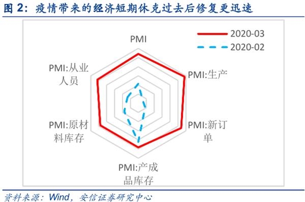 中国3月PMI指数回升,经济恢复好于市场预期。3月31日国家统计局发布数据,3月中国制造业采购经理指数(PMI)52.0%,较上月回升16.3个百分点。当然PMI作为环比数据,反映的是短期经济变化,当PMI连续三个月以上同向变化时,才能反映经济运行的趋势性变化。但PMI数据好于预期一定程度上也反映了国内疫情好转,政策逐步加码,复工生产加快的有利环境下,企业信心的迅速改善。