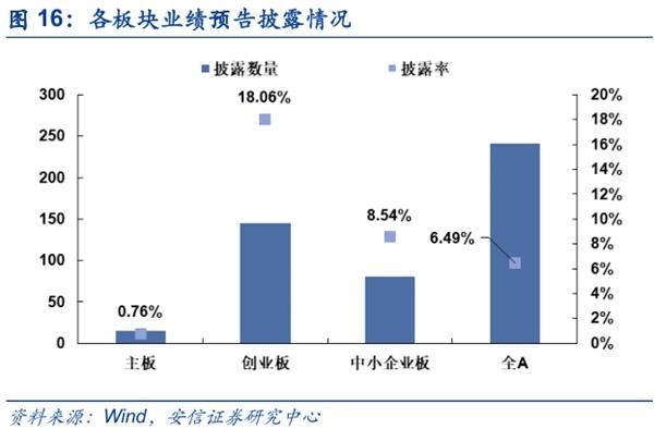 截至4月6日早上10点,全A共约250家披露一季报业绩预告,披露率为6.49%。其中,创业板披露率较高,为18.06%(4月10日将披露完毕),其他板块披露率均不足10%(截止披露日为15日)。