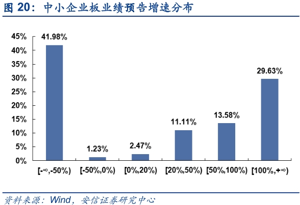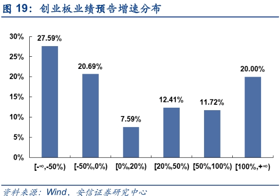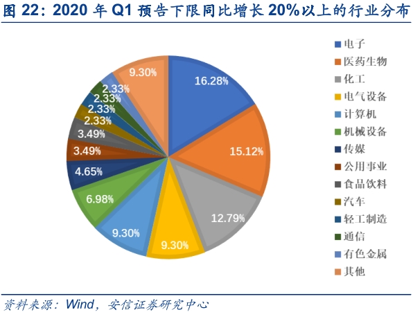 从已披露创业板一季报业绩预告来看,预喜率为51.03%,结合一季报预告增速分布来看,创业板一季报业绩增速降幅超过50%的占比为27.59%,正增长超过50%占比也有31.72%(中小板则分别为41.98%和43.21%),已披露一季报业绩预告高增长企业的行业分布,发现业绩预告下限同比增长幅度大于20%的企业主要集中在电子、医药生物、化工和电气设备行业,分别占比16.28%,15.12%、12.79%和9.30%。