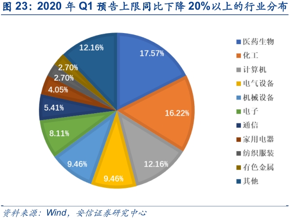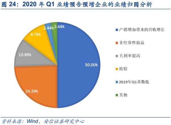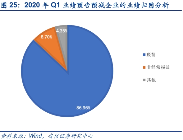 进一步,我们对A股市场当前已披露一季报业绩预告的公司进行归因分析,发现一季报预告业绩高增长的公司主要原因是产销增加带来的营收增长(占比50.00%),这类公司主要集中在电子、电气设备等领域;由成本下降等带来的毛利率上升占比10.98%,这类公司主要集中在化工领域;直接受益于疫情带动销量的占比较低(9.76%),这类公司主要集中在医药行业;而业绩大幅下滑的公司基本上都是受疫情影响而造成的企业中下游复工延迟、原材料紧缺、订单减少和成本上升(占比86.96%)。具体而言,对于业绩预告预增或扭亏的公司进行归因分析,主要有以下几类: