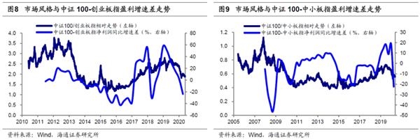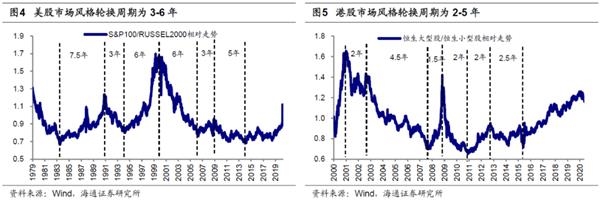 传统的股票市场风格主要分为价值与成长。价值型公司具有一定规模、市值较大,产业组织成熟,而由于各种原因,相比于现有收益其公司股价被低估。价值股具有低市盈率与市净率、高股息的特征,价值股股价往往能够保持长期平稳增长。而成长型公司发展较快、市值小,未来成长潜力巨大,成长股的特点是高收益、高市盈率与市净率,成长股股价在短期可能快速上涨。我们前期多篇报告《风起于青萍之末-20190710》、《关键词:龙头、成长——2019年市场风格展望-20181224》研究过,美股、港股、A股都存在典型的价值成长风格轮换特征,美国大小盘(大盘指数:S&P100 VS 小盘指数:RUSSEL2000)轮换周期长度为3-6年,小盘股胜出的年份是:1978-1982年、1990-1993年、2000-2005年、2008—2017年。香港大小盘(大盘指数:恒生综指 VS 小盘指数:恒生小型股)轮换周期是2-5年。A股因为是新兴市场所以大小盘(大盘指数:上证50、中证100、申万大盘 VS 小盘指数:创业板指、中证1000、申万小盘)轮换周期更短,一般是2-3年,成长股胜出的年份是:2009-2010年、2013-2015年。2016-2018年整体价值占优,2019年开始风格钟摆向成长回归,目前仍在这一过程中,今年以来成长相对占优。市场风格的变化主要受流动性、经济基本面、企业盈利、相对估值这四个方面的影响。其中经济基本面对风格有一定的影响,经济向好时往往更利于价值股,但两者也出现过背离。相对估值变化是风格切换的价格表现,触及风格区间极值时易促成风格转变。此外,流动性对风格的影响并不稳定,流动性升降促成的风格并不一致,最典型的矛盾是13年与17年均出现利率上行、流动性下降,市场风格在13年是成长占优,在17年则是价值占优。从长期来看,企业盈利能力是决定股价涨跌的根本所在,因此市场盈利趋势才是影响风格的核心变量,盈利趋势分化是风格切换的分水岭。16-17年的价值占优以及18年的风格弱化均与盈利趋势的变动有关。