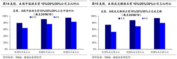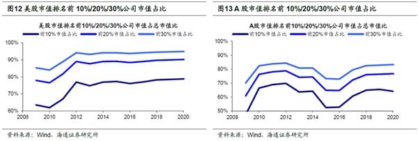 以股市为例,美国行业集中度远高于中国。回顾美股09年至今11年长牛表现,其结构分化严重,龙头公司股价涨幅远超美股中位数,市值占比最低的公司股价大幅缩水,股市呈现出强者愈强、弱者愈弱的马太效应。当前美股市值最高前10%公司市值占总市值78.8%,前20%公司市值占总市值90.2%,前30%公司市值占总市值94.9%。此外,美股成交额排名前10%公司成交额占总成交额73.6%,前20%公司成交额占总成交额87.2%,前30%公司成交额占总成交额93.6%。整体上看09年3月6日至今道琼斯工业指数涨幅达299%,但从不同市值公司涨幅看,美股内部差异较大,美股市值前最大20只公司股价涨幅中位数为629%,市值最高前10%公司为421%,市值最高30%公司为322%,均高于美股中位数50%,而市值最低30%公司为-50%,市值最低10%公司为-83%。龙头公司涨幅高企的原因一方面在于龙头公司经营良好、业绩优异,且估值相对便宜;另一方面,美股尤其是龙头公司热衷回购,大规模回购通过影响市场预期推动企业估值上涨,从而推高股价。同样,中国A股市场开始显现出类似的趋势,龙头企业的市值、成交量占总市场份额比例高,涨幅表现优于A股中位数,结构性差异逐渐凸显。具体来看,目前A股市值前10%公司市值占比为64.1%,前20%公司市值占比达76.2%,前30%公司市值占比达83.1%。从成交额看,A股成交额前10%公司占总成交额52%,前20%公司成交额占比达69%,前30%公司成交额占比达79%。从A股涨幅看,考虑到2014年沪港通开通,我们统计自15年初至今A股市值前最大20只公司股价涨幅中位数为110%,市值最高前10%公司为100.4%,市值最高30%公司为45.4%,高于A股中位数-0.77%,而市值最低30%公司为-18.1%,市值最低10%公司为-33.2%。与美股发展路径类似,中国A股市场龙头公司的市值及成交额比重不断上升,占总量50%以上,龙头公司吸引资金能力强,股价涨幅远高于A股中位数水平。而相比美股,A股头部公司的市值占比不高,借鉴美股发展经验,未来A股资金可能进一步向头部公司集中,龙头公司市值仍有上涨空间。