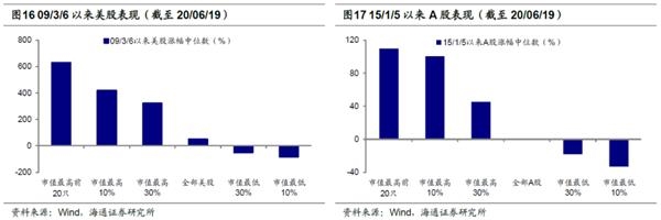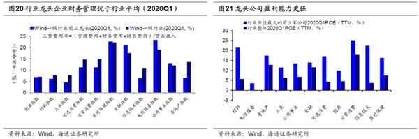 基本面:头部市占率提升,基本面更优。首先从A股传统的成长价值风格看,风格2-3年一变,目前仍是成长占优,详见《谈风格:风起于青萍之末-20190710》、《回顾美国1980-2000年科技长牛-20200109》、《本轮科技周期到哪步了?-20200217》。展望未来2年我们正处于5G引领的新一轮科技周期,19年7月开始成长风格占优,对应科技盈利整体向上。从时空看目前风格回归成长还未走完,2019年6月至今中证100/创业板指收盘价比值从2.5降至1.7,中证100/中小板指收盘价比值从0.68降至0.54,距离16年初成长向价值切换各自低点1.3、0.4仍有空间。从估值比价看,中证100/创业板指PE(TTM)从19年中0.23降至目前0.17,中证100/中小板指PE从0.47降至目前0.33,距离16年初成长向价值切换各自低点0.14、0.29仍有空间。无论是价值成长还是大小盘风格,切换背后的核心是基本面差异,从基本面出发我们认为A股头部集中的风格趋势才开始。首先从宏观背景看,龙头公司高ROE是在我国产业结构加速转型的大背景下出现的,行业集中度提升成为这一时期的典型特征。从产业生命周期理论看,随着经济步入由大到强阶段,行业扩容空间收窄,技术、渠道成本、环保等因素使得行业进入壁垒提高,部分产能过剩,小企业淘汰,成熟期大厂商彼此势均力敌,更多通过提高质量和改善性能来增强竞争力,这一阶段消费者收入提升对消费品质更加注重,消费升级促使本土品牌崛起。如第二部分提到,包括美国及中国经验,行业集中度提升是经济结构转型调整的重要特征,数据显示自2010年以来消费类和投资类行业集中度逐步提升,包括白酒、乳制品、医药流通、空调、冰箱、洗衣机、水泥、地产、煤炭等。龙头公司市占率不断提升,与此同时,龙头企业财务管理、成本控制也优于行业整体,使得行业集中度提升过程中龙头企业更为受益。选取一级行业市值前三的龙头企业构建组合,截至2020Q1,比较龙头股组合和一级行业平均三费费用率(财务费用、管理费用、销售费用),除医疗保健、金融、电信服务、公用事业行业龙头公司三费费率略高于行业整体水平外,其余行业龙头三费费率均低于行业整体水平,即龙头公司成本控制优势更强,在市占率提升过程中,基本面更优,我们以ROE(TTM)作为盈利指标,比较龙头股组合和一级行业20Q1 ROE(TTM),十大行业龙头公司ROE均高于行业整体水平。往后看我们认为行业集中度提升过程仍将持续,这是龙头效应持续的基本面支撑。