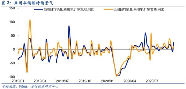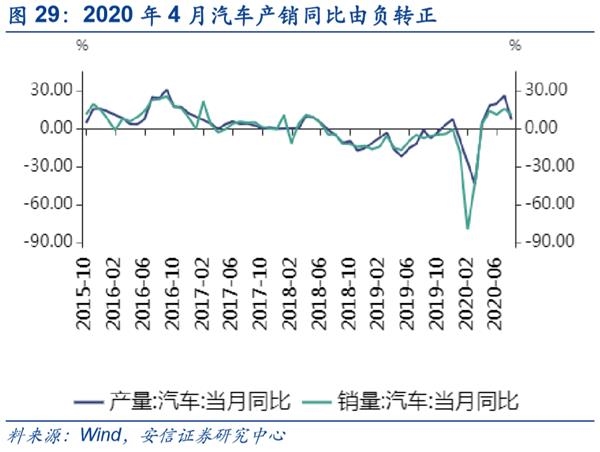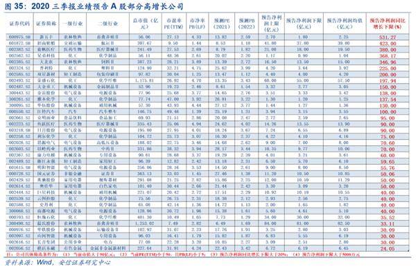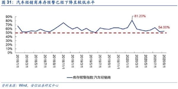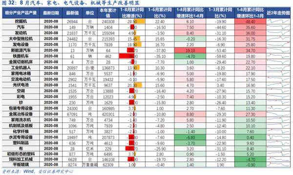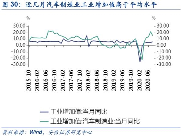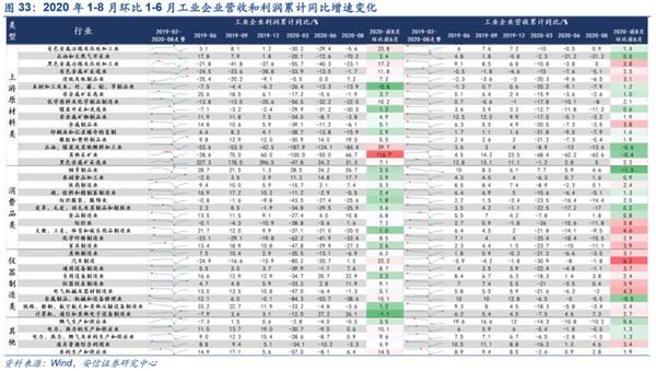 其中,最为明显的景气特征是汽车产业链的修复,8月汽车制造业利润增速保持55.8%的快速增长,明显高于工业平均水平。从汽车行业自身销售数据来看,2020年初新冠疫情爆发后,2月汽车销量同比降幅一度达到近80%。在中央及地方政府相继出台系列刺激政策后,4月汽车销量开始转正,5-8月恢复两位数增长。截止8月,2020年全年汽车累计产销分别为1440.77万辆和1452.82万辆,同比降幅分别收窄至9.49%和9.68%,总体表现好于预期。结合已经公布三季报代表性预告的上市公司龙头来看,我们会发现汽车产业链的带动效应已经开始在化工(涂料、改性塑料)、计算机(汽车相关软件开发)、电子(新能源车相关电子零部件)和机械(发动机、基础件)中得到侧面印证。根据安信汽车行业组观点,汽车产销数据预计后续仍将维持较强复苏态势,电动智能大潮催生结构性成长。