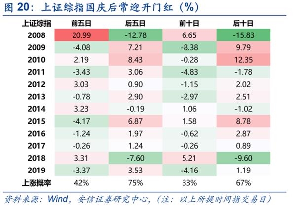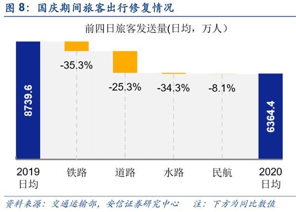 十一长假期间,部分中观行业数据好于预期。国家电影专资办发布数据显示,10月1日至7日我国电影票房约为36.96亿元,取得中国影史国庆档票房第二的成绩。其中《我和我的家乡》《姜子牙》《夺冠》位列档期票房前三。中国银联透露,国庆长假前7天(1至7日)银联网络的交易金额达到2.16万亿元,相比去年同期增长了6.3%;今年国庆与中秋双节合一,当天交易金额超过3300亿元,同比增长15.5%。