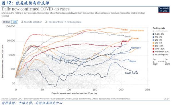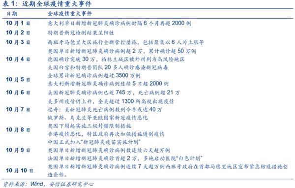 同时,疫苗的进展对复苏节奏预期也是一个外部变量。10月9日中国宣布已同全球疫苗免疫联盟于8日签署协议,正式加入“新冠肺炎疫苗实施计划”(COVAX)。该计划由全球疫苗免疫联盟(Gavi)、世卫组织(WHO)和流行病防范创新联盟(CEPI)创建,目的是提高疫苗研制效率,为疫苗快速生产和大量、公平地普及奠定基础。计划预计在2021年年底前在全球范围内提供至少20亿剂安全有效的新冠疫苗。被誉为“应对新冠危机的全球唯一解决方案”。我们预计今年年底中国和部分发达国家将有望率先普及新冠疫苗,并在明年上半年快速覆盖大部分易感人群。为全球经济复苏注入强心针。