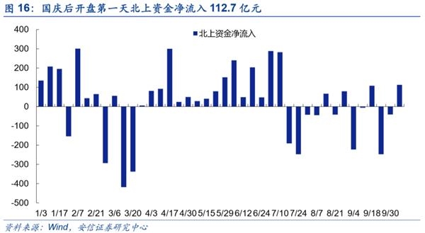 同时我们观察到,近期人民币升值速度加快,9日在岸人民币兑美元收盘报6.7135,离岸人民币收报6.6907均创17个月来高位,反映出市场对中美担忧趋缓,开始集中反映中国复苏趋势占优的基本面逻辑。在此期间,节前避险行为较多的外资节后再度流入A股,国庆后开盘第一天北上资金净流入112.7亿元。