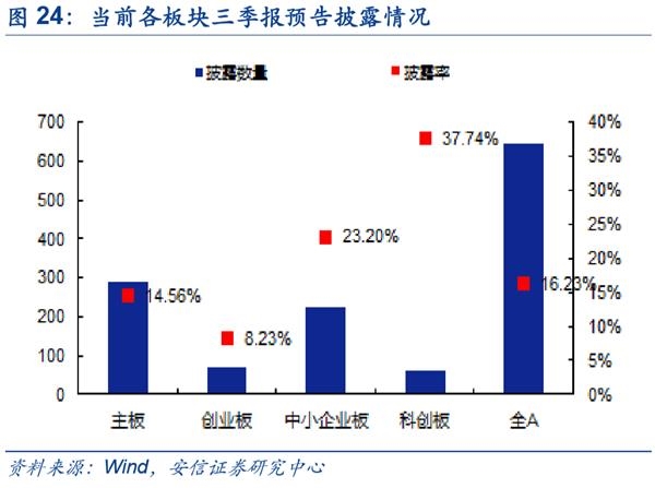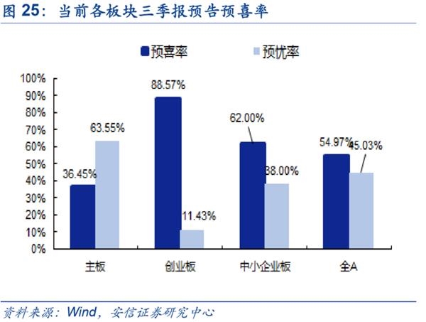 截至10月11日早上10点,全A(含科创板)共644家上市公司发布了三季度业绩预告(有效样本为399家),整体披露率为16.23%,数据代表性依然偏低。其中,主板、创业板和中小板披露率分别为14.56%,8.23%和23.20%。其中,全A预喜率和预忧率大致持平,在有效样本下预喜率提升至65%,其中略增和预增比例占比预喜公司近8成,同时,中小创的预喜率较主板明显偏高。(需要提醒的是随着后续披露,以上数据存在进一步调整的可能。)
