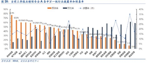 从目前披露的三季报业绩预告来看,预喜率较高的行业分别为:农林牧渔、电气设备、电子、军工、医药。结合截止8月的工业企业数据,三季度高细分景气领域主要集中以下几个领域:电气设备、电子、化工、机械、轻工制造、食品饮料、通信、有色、医药等。
