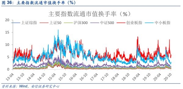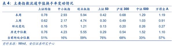 本周市场情绪提振明显。从换手率来看,本周五主要指数换手率均有所上升。本周五上证综指,中小板指,创业板指,上证50,沪深300,中证500,万得全A的流通市值换手率分别为0.78%,2.93%,5.94%,0.42%,0.68%,1.29%,1.19%,分别较前周变动0.62,2.17,4.74,0.30,0.49,1.03,0.91个百分点,分别处在51%,16%,59%,76%,68%,33%,57%分位数水平。