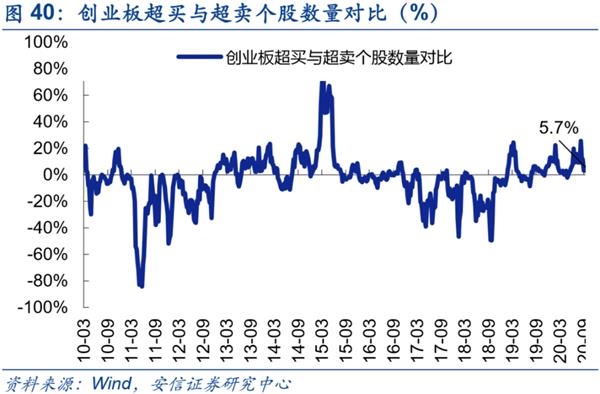 近四个交易日大盘呈企稳态势。当前市场强势个股数量占比65.4%,较四个交易日前上升2.3个百分点,超买个股与超卖个股之差占比2.05%,上升1.1个百分点。创业板来看,强势个股数量占比83.7%,较四个交易日前上升1.3个百分点,超买个股与超卖个股之差占比5.69%,下降2.4个百分点。